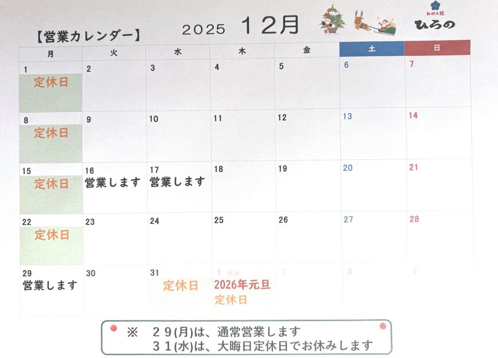 2025.12月 営業案内 お店情報 Facebook コピー 2025/12/3 〇 12/16(火)、17(水)、は通常営業いたします 〇 29(月)、通常営業いたします 〇 31(水)大晦日、2026年元旦はお休みを頂きます
